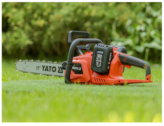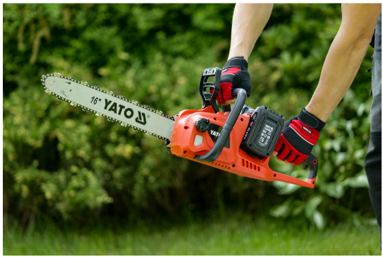 Акумулаторен верижен трион с мощен безчетков мотор. Захранва се от две батерии 18 V, което осигурява дълго време на работа с едно зареждане (не са включени).