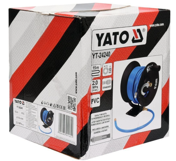 Пневматичен маркуч на макара със стандартни бързи връзки. Възможност за монтаж на стената или на пода.